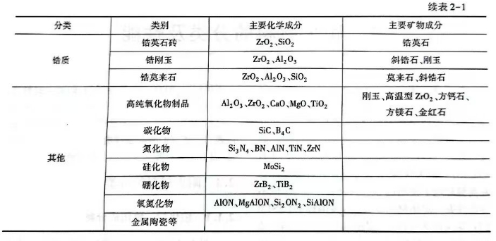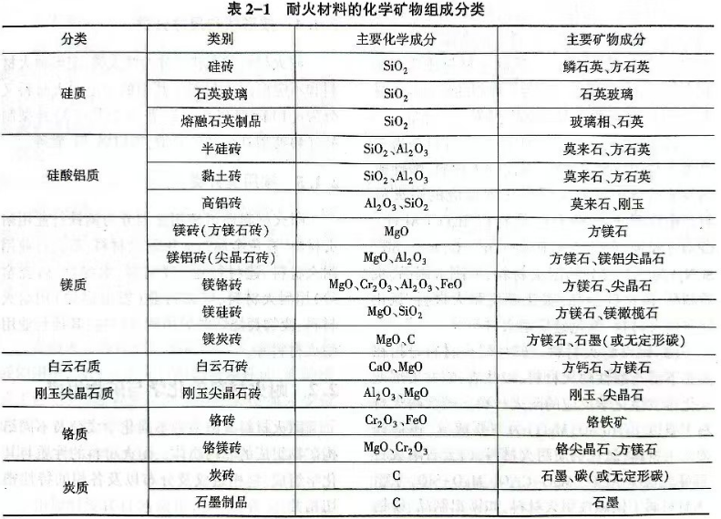 耐火材料的化学矿物组成分类见表。